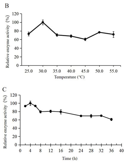 Effect of type and concentration of cross-linking agent, cross-linking temperature, and cross-linking time on immobilized lipase-specific activities. (A) Glutaraldehyde, poly (ethylene glycol) diglycidyl ether, and ethylene glycol diglycidyl ether were investigated. The control group was only treated with adsorption. (B) Cross-linking agent is glutaraldehyde. (C) Cross-linking agent is glutaraldehyde and enzymatic reaction temperature is 30 °C. The means value of three replicates ± SD is represented.