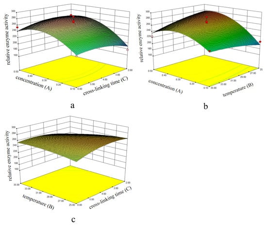 Table 1 shows that the order of influence of the three factors on the immobilization of KDN lipase is as follows: the concentration of the cross-linking agent (A) > the cross-linking temperature (B) > the cross-linking time (C). Among them, the cross-linking agent has a very significant influence on the immobilization of KDN lipase (p < 0.01). The Design Expert V8.0.6 software was used to analyze the interactions between various factors. The analysis results are shown in Figure 3. Combined with Table 1, it can be seen that the interaction between the concentration of cross-linking agent and the cross-linking temperature had a greater impact on the immobilization of KDN lipase by adsorption/cross-linking.