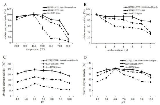 Furthermore, the pH stability for KDN@LXTE-1000/Glutaraldehyde, KDN@LXTE-1000, and free KDN lipase was determined by incubation at different pH ranges from 4 to 10. The optimum reaction pH of KDN@LXTE-1000/Glutaraldehyde, KDN@LXTE-1000, and the free enzyme was 6.0. At pH 4.0, the residual activities for KDN@LXTE-1000/Glutaraldehyde, KDN@LXTE-1000, and the free enzyme declined to 84.80%, 73.43%, and 52.25%, respectively. At pH 10.0, the residual activities for KDN@LXTE-1000/Glutaraldehyde, KDN@LXTE-1000, and the free enzyme declined to 76.15%, 67.90%, and 49.95%, respectively (Figure 4C,D). The pH has a great influence on the stability of the enzyme. It can be seen that the immobilized enzyme has the best pH stability after cross-linking. However, a continuous increase in pH can lead to a decrease in the immobilization efficiency. This may be due to changes in the enzyme’s protein structure under these pH conditions [26].