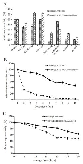 The stability of lipase in the presence of a solvent is very important. It can be seen from Figure 5A that after cross-linking, the tolerance of the immobilized KDN lipase to organic solvents, such as n-hexane, cyclohexane, isooctane, petroleum ether, isopropanol, acetone, and ethanol, is improved. The tolerance to petroleum ether only decreased. Moreover, cyclohexane and isooctane can activate the activity of the enzyme immobilized by adsorption/cross-linking (KDN@LXTE-1000/Glutaraldehyde). It can be seen that the tolerance to organic solvents of the immobilized KDN lipase by adsorption/cross-linking is better than that of the immobilized KDN lipase by adsorption (KDN@LXTE-1000). In industrial large-scale productions, the use of organic solvents is inevitable. Therefore, it is very important that the immobilized enzyme can improve the tolerance to organic solvents, which can enable laboratory preparation to be transformed into industrial manufacturing.
