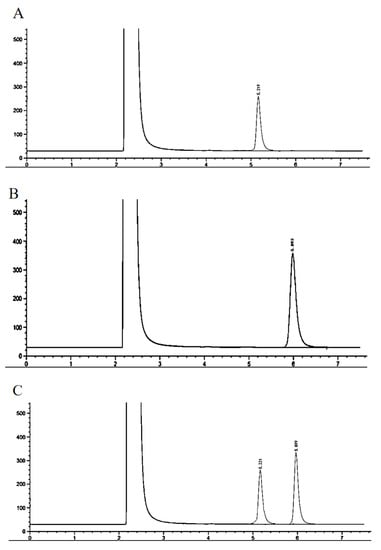 GC chart of substrates and products. (A) GC chart of myristic acid. (B) GC chart of isopropyl myristate. (C) GC chart of myristic acid and isopropyl myristate.