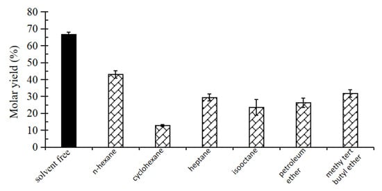 The influence of the solvent system on the synthesis of isopropyl myristate by adsorption/cross-linking immobilized KDN lipase is shown in Figure 7. The results in Figure 7 show that the yield of isopropyl myristate catalyzed by the six organic solvent systems is not high, and the molar yield of isopropyl myristate in n-hexane is the highest, at 42.99%, the molar yield of cyclohexane is low, at 12.79%. However, the yield of isopropyl myristate in a solvent-free system was higher than that in organic solvents because of the adsorption/cross-linking immobilized KDN lipase. The experiments showed that adsorption/cross-linking immobilized KDN lipase was more suitable for the synthesis of isopropyl myristate in a solvent-free system.