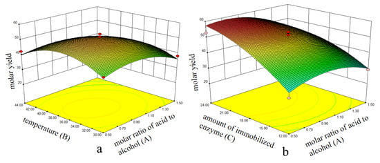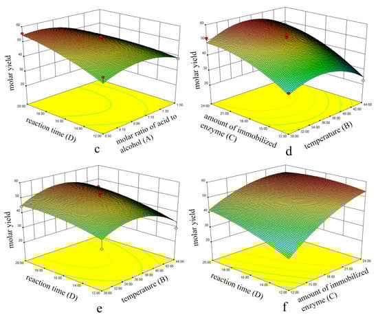 It can be seen from Table 2 that the order of influence of the four factors on the molar yield of isopropyl myristate is as follows: amount of immobilized enzyme (C) > reaction time (D) > molar ratio of acid to alcohol (A) > reaction temperature (B). The additional amount of the immobilized enzyme has a very significant effect on the molar yield of isopropyl myristate (p < 0.0001), and the reaction time and molar ratio of acid to alcohol have a significant effect on the molar yield of isopropyl myristate (p < 0.05). The Design Expert V8.0.6 software was used to analyze the interaction between various factors. The analysis results are shown in Figure 8. In combination with Table 2, it can be seen that the interaction between molar ratio of acid to alcohol and reaction time, the interaction between amount of immobilized enzyme and reaction time have a greater impact on the molar yield of isopropyl myristate.