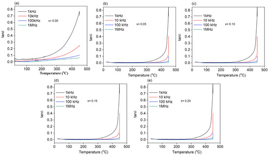 Variations in tan δ for (NBT-BT-NBN1−xTx) ceramic compositions: (a) x = 0.00, (b) x = 0.05, (c) x = 0.10, (d) x = 0.15, and (e) x = 0.2, as a function of the temperature with increasing frequencies.