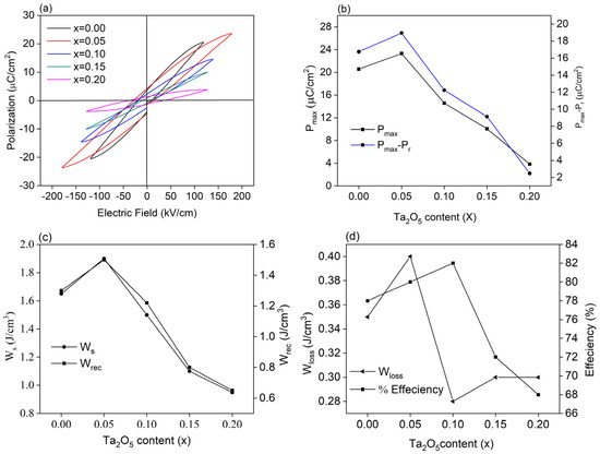The polarization vs. electric field (P–E) hysteresis loops for the (NBT-BT-NBN1−xTx) (x = 0.00, 0.05, 0.10, 0.15, 0.20) ceramic compositions are depicted in Figure 5a. The P–E loops were measured at a frequency of 10 Hz for each ceramic composition with a 0.3 mm thickness. Large variations in the maximum polarization (Pm) and breakdown electric fields (Eb) were observed for each ceramic composition. The energy storage characteristics, such as energy storage/charged density (Ws), recoverable or discharge energy density (Wrec), and efficiency (η), of each ceramic sample were determined from its P–E hysteresis loop area. Each sample has its own breakdown voltage related to the average grain size and density of the sample. The P–E loop for each composition was measured at its breakdown voltage.