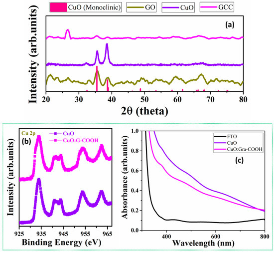 (a) XRD spectra of sputter-grown CuO (500 nm) on FTO and sputter-grown sol-gel spin-coated CuO:Gra-COOH (20 nm) on FTO photoelectrodes, which are matched with monoclinic CuO; (b) XPS spectra of CuO and CuO:G-COOH; and (c) UV-visible spectra of FTO, CuO and CuO:G-COOH. CuO—Copper Oxide, GCC—Gra-COOH/CuO.