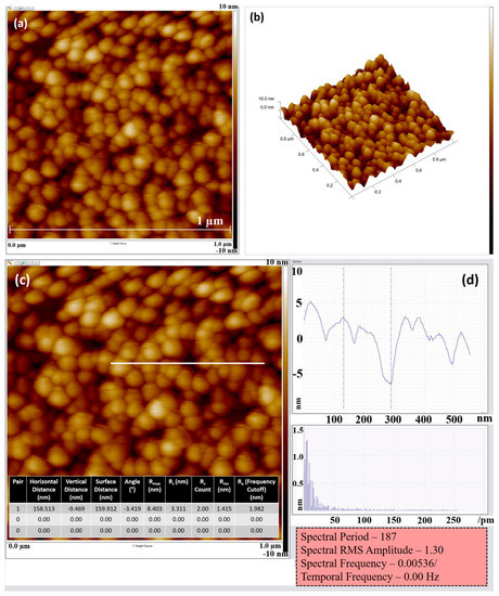 In general, photocatalytic activity is influenced by the morphology of materials to a great extent. In order to understand the surface morphology, crystal structure, grain size and roughness of the CuO:Gra-COOH photoelectrode, atomic force microscopy (AFM) studies were carried out, as shown in Figure 3. Figure 3a shows the 2D AFM image, and Figure 3b shows the 3D view of spherical particles with aggregations at different magnification ranges of 10–100 mm. It is observed that the nanoparticles are scattered without any clustering and that the surface morphology of the film is highly homogenous. Figure 3c depicts a clear image of a cross-section at high resolution, and Figure 3d corresponds to the appropriate cross-section profiles indicated by lines. Basically, grain size was influenced by the interaction between nucleation and growth rates. The topographic map reveals that the nanoparticles’ surfaces are spherical in shape. The rough surfaces have a higher number of active sites and a relatively larger surface area. Compared to recombination, a rough-surface film is expected to have a larger electrode or electrolyte interfacial area, which increases charge-transport rates. As a result, because it inhibits the recombination of photogenerated charge carriers, this type of film can play a vital role in PEC activity.