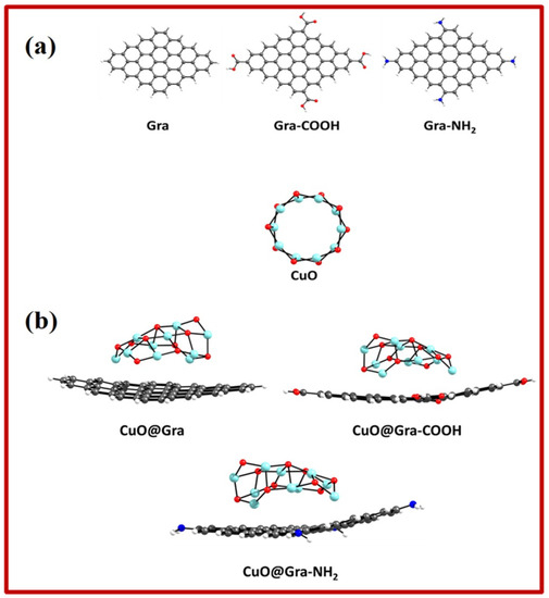 (a) Optimized geometries of pristine graphene sheet (Gra), carboxylic acid functionalized graphene (Gra-COOH), amine functionalized graphene (Gra-NH2) and CuO cluster; (b) optimized geometries of CuO@Gra, CuO@Gra-COOH and CuO@Gra-NH2 complexes. Grey, Cyan, Red, Blue and White color represents C, Cu, O, N, and H atoms.