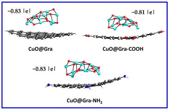 Additionally, the charge distribution for CuO-Graphene complexes was calculated using Mulliken population analysis. Mulliken charges were calculated based on the charge population that each atom defines as its basic functions [58]. Figure 7 shows the Mulliken charge distribution for various CuO-Graphene complexes produced by the B3LYP-D/6–31G** level of theory. We observed charge transfer from graphene to CuO clusters. The calculated charge distribution for the CuO-Gra and CuO-Gra-NH2 complexes showed an almost similar charge distribution (−0.83|e|), whereas in the case of CuO@Gra-COOH, the calculated charge distribution was −0.81|e|.