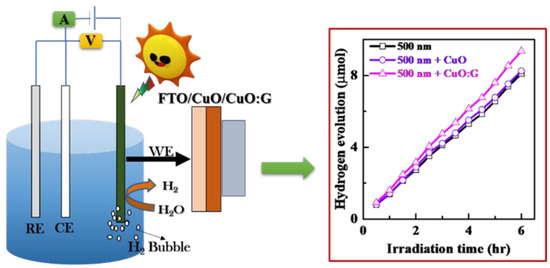 Enhanced and sustainable solar energy production is essential to support increasing consumption and environmental requirements [1,2,3,4,5,6]. In that respect, efficient catalysts play an important role in their overall performance. The most functional catalysts for green hydrogen (H2) production via water splitting (WS) (thermodynamic potential of 1.23 V) are generally metallic or semiconductor materials [7]. A low-cost semiconducting photocatalyst with outstanding aqueous-electrolyte stability and high visible-light absorption is always envisioned as the best material for such applications [8]. In photoelectrochemical water splitting (PEC-WS), the light energy is absorbed by a semiconductor material to form electron–hole pairs, and the photo-induced electrons (or holes) are directed to the semiconductor/solution interface by the space-charge field, where they reduce (or oxidize) water [9,10,11,12,13]. On the other hand, a photocathode should be a p-type semiconductor for the hydrogen evolution reaction (HER), which means the conduction band edge is more inclined towards the negative than the potential of H2O/H2 [9,10,11,12,13,14]. Among other semiconducting materials, cupric oxide (CuO) [15,16,17] can be an ideal candidate for such applications as it is a p-type semiconductor that is abundant, inexpensive and has appropriate optical and electronic properties for photovoltaic (PV) [18] or photoelectrochemical (PEC) [19] applications. In particular, CuO thin films demonstrated 2–3 times enhanced PEC performance along with increased transmittance and electrical conductivity [20]. The advantages of CuO as a material for solar-cell applications include a suitable band gap (1.3–1.5 eV), [21] high optical absorption, a maximum theoretical efficiency of 31%, low cost and terawatt-level scalability [22]. Additionally, hydrogen produced via solar energy is an important, relatively clean fuel that can be used in fuel cells. The research community focuses on creating high-efficiency visible-light photocatalysts that can harness solar light effectively [23,24,25,26,27,28] and can be integrated with photovoltaic devices for green hydrogen production.