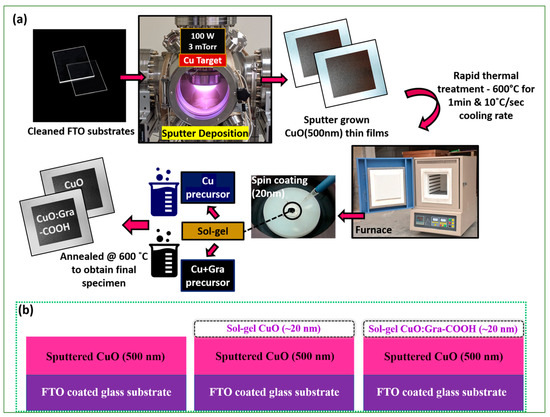 FTO-coated glass substrates were used to deposit CuO thin films. Before nitrogen gas dried, the substrates were ultrasonically cleaned in IPA for 10 min. The substrates were cleaned before being introduced into the CuO thin-film-sputtering chamber for deposition. CuO thin film with a thickness of 500 nm was deposited on FTO substrate by using sputter deposition. In an argon atmosphere, CuO target at 100 W was sputtered at a pressure of 3 mTorr. Rapid thermal annealing was performed after deposition to increase the crystal quality of the CuO film. Following that, samples were annealed in nitrogen at 600 °C for 60 s (heating and cooling rate of 10 °C/s) by rapid thermal treatment (RTT). CuO and incorporated graphene CuO thin film were then deposited on the sputter-grown CuO (500 nm)/FTO substrates via sol-gel/spin-coating technique, as shown in Figure 11a,b.