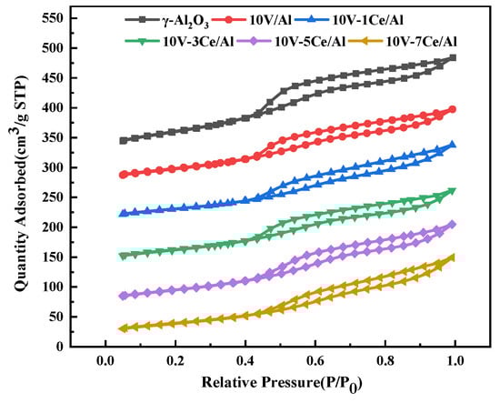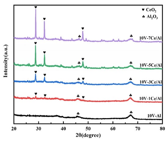 Figure 1 shows XRD profiles of the fresh 10V/Al, 10V-1Ce/Al, 10V-3Ce/Al, 10V-5Ce/Al, and 10V-7Ce/Al oxygen carriers. The diffraction peaks at 2θ = 45.56° and 67.03° are assigned to mesoporous γ-Al2O3 (JCPDS 10-0425) []. With increasing Ce content in the oxygen carrier, the peak intensity corresponding to the CeO2 phase becomes sharper and more intense. The diffraction peaks at 2θ = 28.89°, 32.38°, and 47.85° characterize the cubic crystal structure of the CeO2 phase, indicating that CeO2 exists in the cubic fluorite phase. The diffraction peaks of VOx species are absent, possibly because these species are highly dispersed on the surface of the γ-Al2O3 carrier, rendering them undetectable by the XRD instruments [].