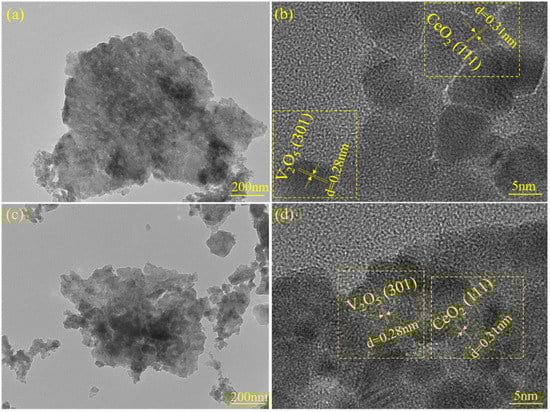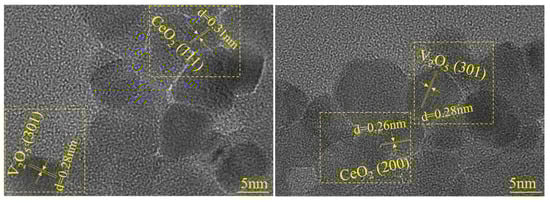 Figure 3 shows the TEM of a fresh 10V-3Ce/Al oxygen carrier, where the polycrystalline material consists of small randomly oriented crystal structure domains. The lattice stripe spacing d = 0.31 nm and 0.26 nm correspond to the (111) crystal plane and the (200) crystal plane of CeO2, respectively []. The lattice stripe spacing d = 0.28 nm corresponds to the (301) crystal planes of V2O5 []. By Figure 2 and Figure 3, it is shown that CeO2 and V2O5 are uniformly dispersed on the surface of the oxygen carrier.