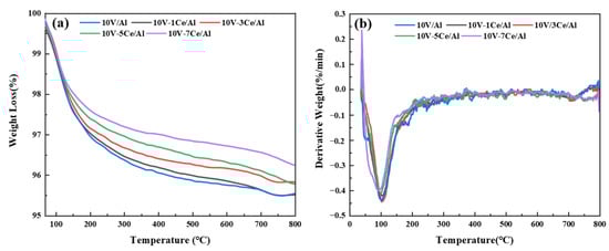 Figure 5 plots the TGA and differential thermogravimetric (DTG) curves of the 10V-XCe/Al samples (X = 0, 1, 3, 5, 7) as the temperature was increased from 50 °C to 800 °C in inert nitrogen gas. The DTG curves (Figure 5b) present a weight-loss peak at 90–120 °C, which probably represents the evaporation of physical water molecules from the sample surfaces []. The oxygen carrier with the highest cerium content (7 Ce) shows the least weight loss (Figure 5). The thermal stability of the oxygen carriers increases with increasing Ce loading, probably because the CeO2 phase inhibits γ-Al2O3 sintering and phase transition at high temperatures [].