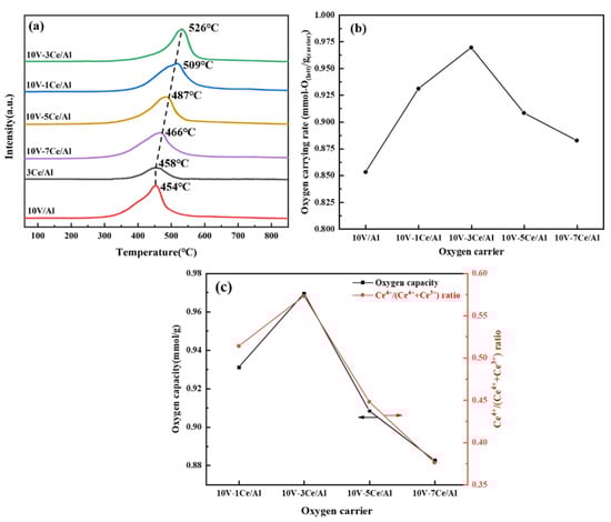 The reducibility and oxygen-carrying capacities of the oxygen carriers were characterized using H2-TPR. The H2-TPR curves of all oxygen carriers are shown in Figure 6a. The 3Ce/Al oxygen carrier shows a reduction peak near 450 °C, which is attributed to the reduction of Ce4+, and the reduction peak of CeO2 phase overlaps with the reduction peak of VOx species []. The 10V/Al oxygen carrier shows an initial large reduction peak near 450 °C, attributed to the reduction of amorphous monomer or polymeric VOx species phases with oxidation states between V5+ and V4+ []. Therefore, in the temperature range of 400-550 °C, the H2 absorption is equal to the sum of H2 consumed during the reduction of the VOx phase and the CeO2 phase. Increasing the Ce loading increasingly shifts the position of the reduction peak from that of 10V/Al. Therefore, CeO2 changes the reducibility of the oxygen carrier. Moreover, the reducibility decreases gradually with temperature from left to right and its strength decreases in the order of 10V/Al > 10V-7Ce/Al > 10V-5Ce/Al > 10V-1Ce/Al > 10V-3Ce/Al. Gu [] and Leon [], who investigated the relationship between oxygen carrier reducibility and propylene selectivity, reported that lower reducibility usually corresponds to higher propylene selectivity.