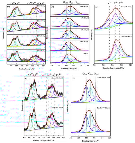 Figure 7a shows the Ce 3d XPS spectra of the oxygen carriers. Due to the splitting of the Ce 3d3/2 and Ce 3d5/2 main peaks and the different final states after relaxation, the XPS spectra of Ce species can be deconvoluted into six peaks. Peaks at 904.03 and 885.22 eV were attributed to Ce3+, and peaks at 907.04, 900.72, 898.17, and 881.74 eV were attributed to Ce4+ []. The Ce4+ species improve the electron-transfer channel and optimize the activity of the oxygen-carrier Olatt, thereby facilitating the dehydrogenation reaction []. Increasing the Ce loading in the oxygen carrier increases the total area of the Ce 3d peak. The Ce4+ to (Ce4+ + Ce3+) ratio is largest (57.32%) in 10V-3Ce/Al whereas the percentage of Ce4+ is smallest (37.64%) in 10V-7Ce/Al. The change in Ce4+/(Ce4+ + Ce3+) ratio follows the oxygen-loading trend of the oxygen carriers (Figure 6c). However, Olatt is present only in CeO2 and is absent in Ce3+ species []. When the mass fraction of Ce content in the oxygen carrier exceeds 3 wt.%, the Ce3+ content increases while the Ce4+ content decreases.