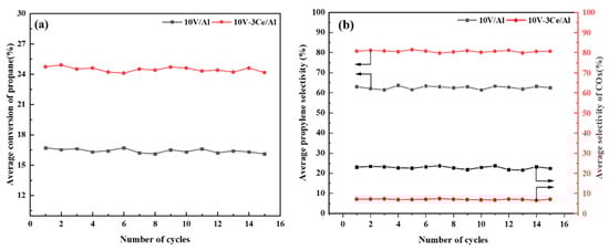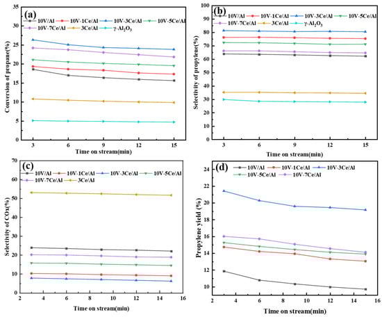 Figure 9a compares the propane conversions of the 10V-XCe/Al oxygen carriers (X = 0, 1, 3, 5, 7). As CL-ODHP consumes Olatt from the oxygen carriers, the propane conversion decreases with increasing reaction time. The average propane conversion rates of 10V/Al, 10V-1Ce/Al, 10V-3Ce/Al, 10V-5Ce/Al, and 10V-7Ce/Al are 16.32%, 18.64%, 24.72%, 20.31%, and 23.16%, respectively, in the time range of 3-15 min. The results show that introducing CeO2 at 550 °C significantly improves propane conversion. Propane conversion is maximized at a Ce loading of 3 wt.%. This improvement can be explained by oxygen loading in the oxygen carrier combined with a structural pore change. Ce increases the oxygen carrying capacity of the oxygen carrier; in particular, Ce4+ inhibits the conversion and loss of Olatt and facilitates the oxidation of propane to propylene []. In addition, a small amount of Ce increases the specific surface area of the oxygen carrier, exposing more active sites on the surface of the oxygen carrier. The propane then reacts more fully.