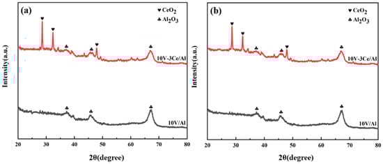 XRD spectra of (a) fresh 10V/Al and 10V10V-3Ce/Al 3Ce/Al oxygen carrier, (b) 10V/Al and 10V-3Ce/Al oxygen carrier after 15 CL-ODHP cycles.