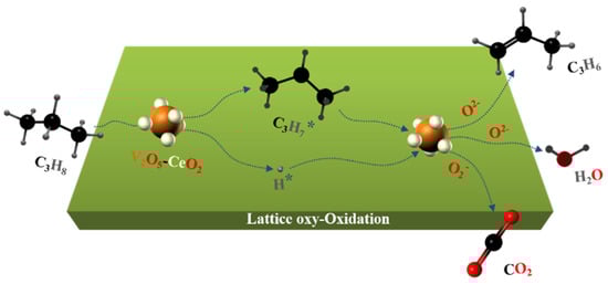 The CL-ODHP follows the Mars-van Krevelen mechanism. The CL-ODHP mechanism was proposed by combining in situ DRIFT and XPS characterization. As shown in Figure 13, the first step of CL-ODHP is the adsorption of propane on the surface of the 10V-3Ce/Al oxygen carrier and the breaking of the propane methylene C-H bond. V5+ is the dehydrogenation activation site []. The rate-limiting step is breakage of the C-H bond of propane to form the propyl radical C3H7* and the hydrogen radical H*. Based on changes in XPS Olatt content before and after oxygen carrier reaction combined with previous in situ DRIFTS characterization, VOx then releases Olatt to selectively oxidize C3H7* and H* to C3H6 and H2O, respectively. CeO2 uniformly dispersed on the surface of the oxygen carrier and controls the release and evolution rate of Olatt, thus avoiding the deep oxidation of C3H7*. However, at high temperatures (600 °C), CeO2 loses its inhibition ability and Olatt rapidly evolves into Oelec, enabling the deep oxidation of C3H7* to CO2 []. Similar results were obtained by Gong et al. and Zuo et al. Gong et al. [] investigated the application of VOx-TiO2 oxygen carriers in CL-ODHP. V5+ is the main C-H bond activation site, and the propyl radical C3H7* and the hydrogen radical H* are generated by the breakage of the propane methylene bond under the activation of V5+. Zuo et al. [] investigated the application of CeO2-modified 17.5 Cr/Al oxygen carriers in CL-ODHP. CeO2 increased the amount of Olatt and enhanced the adsorption of propyl radicals, while Ce4+ modulated the rate of Olatt evolution to Oelec and propyl radicals were further oxidized to propylene.