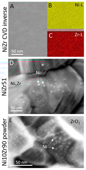 The coked NiZr51 sample in the middle image in Figure 6E exhibits a rather heterogeneous morphology and size distribution of the Ni domains, giving the impression of a bimodal domain size state. In coexistence with small Ni nanoparticles in the range between approx. 5 and 30 nm, large islands with sizes ranging from 100–300 nm are visible.