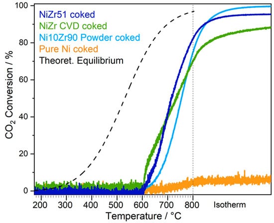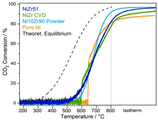 Temperature-programmed CO2 conversion profiles on the fresh model catalysts (first DRM cycles in Setup 1). Reaction conditions for the NiZr51 bulk intermetallic, NiZr inverse intermetallic, and pure Ni foil samples: 50 mbar CH4, 50 mbar CO2, 977 mbar He; linear temperature ramp (10 K min−1) up to 800 °C, followed by isothermal reaction for 30 min. For the Ni10Zr90 supported powder catalyst, initial reactant pressures of 15 mbar CH4 and 15 mbar CO2 diluted in 1029 mbar He carrier gas were used in Setup 4. The dashed line represents the calculated temperature-dependent equilibrium conversion for the 50 mbar CH4 + 50 mbar CO2 reaction mixture toward the experimentally verified ~1:1 H2:CO product ratio (details of calculation see Section 3.2.1).