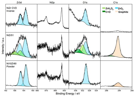 The middle panels depict the NiZr51 bulk intermetallic sample after the first DRM cycle. It is obvious that the reduced suboxidic ZrOx and intermetallic Zr0 species become fully oxidized toward Zr+4 species during dry reforming. In addition to ZrO2, signals at even higher binding energies are assigned to the formation of hydroxylated Zr+4 species, which appear especially on NiZr51. It has been shown that under realistic dry reforming conditions, significant amounts of (intermediate) water are present in the reactant/product mixture leading to ZrO2-assisted activation of H2O and, therefore, to surface ZrOxHy components similar to previously reported species [16,27,28,29]. After DRM, the C1s spectrum of NiZr51 shows a strongly dominant feature at 284.4 eV, indicating the formation of relatively large amounts of graphitic carbon at the catalyst surface, which causes pronounced attenuation of the Ni2p signal. Minor C1s intensity at higher binding energies is also detectable and assigned to the superposition of oxidized carbonaceous species (oxygenate, hydrocarbon-type and graphite oxide) ranging from approx. 266–288 eV [30,31]. The O1s spectrum underlines the presence of these C-oxygenates, as well as of the hydroxylated zirconium species. Interestingly, despite the full oxidation of Zr, nickel prevails in its metallic state after the first DRM cycle.