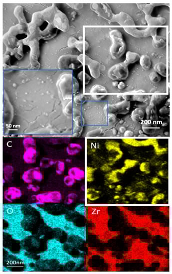 The first question regards, of course, the exact locations at which these extended graphitic deposits accumulate. Complementing the topographic picture of the NiZr51 sample in its post-DRM state (Figure 6E), Figure 7 faces a larger-scale topographic SEM micrograph with the respective EDX data obtained on the zoomed regions. A brighter region in the EDX images (an area marked by a white frame in the topographic overview image) indicates a higher abundance of the respective element. It can be clearly seen that areas with extended carbon deposits coincide with areas where large Ni domains are present. This implies that the major part of the spectroscopically observed coking affects the extended, bulk-like metallic Ni regions. The data also reveal that both the dispersed small particles and the large domains are comprised of metallic Ni and that the rather smooth area in between is Ni-free ZrO2. An inhomogeneous size distribution of the Ni particles/domains is obvious. From the zoom in the blue frame, it is clear that a part of the Ni resides in nanoparticles of approx. 5 nm up to intermediate sizes of ~20 nm, which are rather evenly distributed on the ZrO2 support. The visually dominant entities are large Ni islands ranging from approx. 100 nm to ~300 nm, supporting the interpretation of a quasi-bimodal Ni surface state.