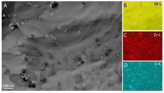 (A) SEM image of the NiZr inverse intermetallic sample after three consecutive DRM cycles. (B–D) Ni-L, Zr-L, and O-K EDX intensities of the region shown in Panel (A).
