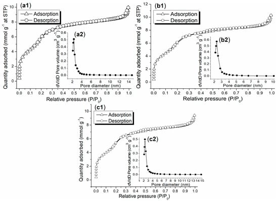 The BET surface area, pore volume, pore diameter, and pore size distribution provided key information on the catalysts’ porosity and internal structure and were measured with a Micromeritics ASAP 2020 (Micromeritics Instruments Corporation, Norcross, Atlanta, GA, USA) on the basis of the N2 adsorption isotherms at 77.35 K. Synthesized catalysts were degassed at 150 °C in a vacuum before testing. Surface area was calculated by applying the multi-point Brunauer–Emmett–Teller (BET) method to the adsorption data with relative pressure P/P0 of 0.06–0.3. Total pore volume was obtained from N2 that adsorbed at P/P0 = 0.97. Both the pore volume and pore diameter were obtained by employing the Barrett–Joyner–Halenda (BJH) method.