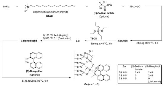In this work, a series of Sn-containing silicates were prepared through a sol-gel process, with tin(II) chloride being employed as the Sn precursor, tetraethoxysilane (TEOS) as the Si precursor, hexadecyltrimethylammonium bromide (CTAB) as the structure-directing agent, and sodium lactate as the crystallization reagent. Furthermore, taking into account the fact that the synthesized samples could have Sn components on the surfaces, it was interesting to test the coordination effects of the attached ligands, which probably affect the efficiency of BVO. Therefore, binaphthol was introduced through a post-synthetic procedure. In comparison with the known Sn-containing silicate BVO catalysts, the presented system used a fundamentally different Sn precursor, structure-directing agent, and crystallization reagent, as well as an additional coordinating ligand, which probably led to quite different catalytic outputs, and the system may show potential for future large-scale applications.