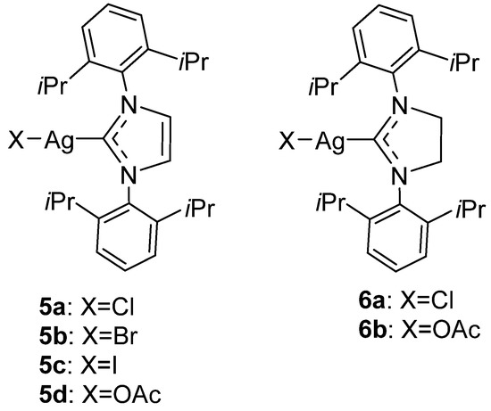 In 2010, Zou et al. [15] described the synthesis of some NHC-Ag-X complexes: 1-cyclohexyl-3-benzylimidazolylidene and 1-cyclohexyl-3-naphtylimidazolylidene chloride and bromide (3a–d) that are reported in Figure 2.