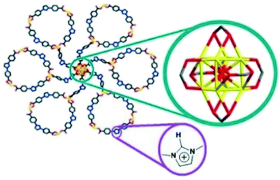The synthesis and the catalytic activity in A3-coupling reactions of a supported Ag(I)-NHC-MOF complex was reported in 2013 [30]. Metal-organic frameworks (MOFs) are efficient heterogeneous catalysts featuring a metallic core and malleable organic linkers (see Figure 5). They display large pores, high surface area, and can selectively adsorb small molecules. To combine the advantageous properties of MOFs and NHCs, the latter can be integrated into MOFs. In this way, systems with multiple, embedded catalytic sites in a single structure can be obtained. According to a previous work by Kitagawa et al., Mousavi, Verpoort and co-workers [31] reported the synthesis of the MOF A, consisting of the [Zn8O] clusters with six metallomacrocycles and NHC moieties, as shown in Figure 5 [30].