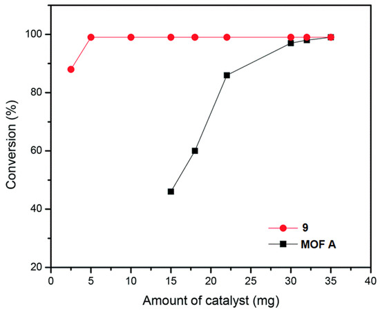 Time-dependent conversion of catalysts MOF A and 9 in A3-coupling reaction.