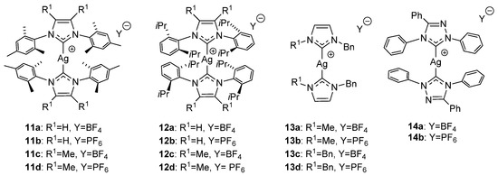 In the years 2015–2017, Bantreil, Mètro, and co-workers [32,33,34] reported the solvent-free synthesis of NHC complexes bearing non-coordinating tetrafluoroborate or hexafluorophosphate counter-anions (11a–d, 12a–d, 13a–d, and 14a–b; Figure 7).