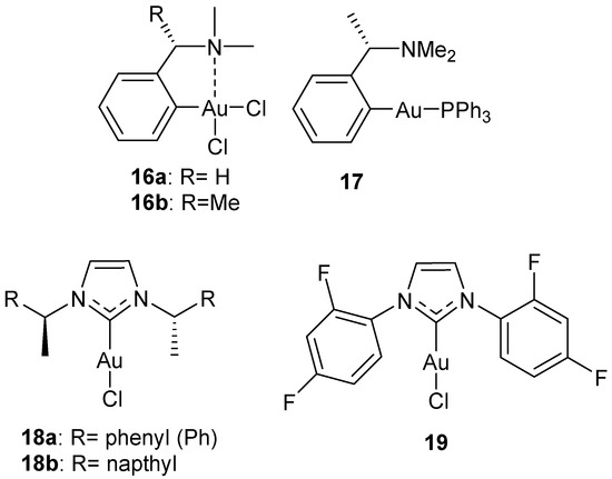 In the same year Quayle et al. [37] reported a study concerning synthesis, characterization and evaluation of the catalytic activity of the gold complexes reported in Figure 9.