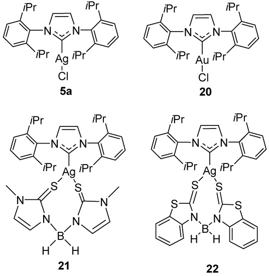 In 2019 A. Neshat et al. [22] presented a study on the synthesis of novel NHC-Ag(I) complexes 21 and 22 by substitution of chlorides in the previously reported complex 5a with homoscorpionate sulphur donor borate ligands (Figure 10). Complex 21 was tested in A3-coupling reactions, and its catalytic activity was compared with that of the complexes 5a and 20 already known. Since complexes 21 and 22 have close characteristics, the catalytic activity of complex 22 was not tested.