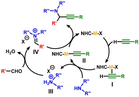 A proposed plausible mechanism for this three-components reaction, catalyzed by a late-transition metal NHC complex, is reported in Scheme 2 [15,17]. After the formation of an intermediate complex by side-on coordination of the alkyne to the metal, the weakly basic amine deprotonates the alkyne (whose acidity is now increased) and thus generates the corresponding metal acetylide. Lastly, the addition of this intermediate to an in situ generated imine (or iminium ion), leads to the desired propargylamine [18,19,20,21,22].