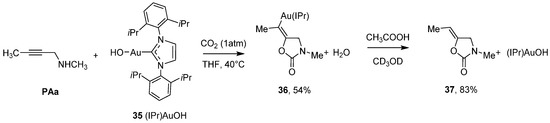 Instead, the silver NHC acetate complex 53 showed better catalytic activity in the synthesis of 2-oxazolidinones by cyclization of propargylic amines than complex 52. As listed in Table 35, all the examined reactions give good yields. The reaction times vary from 1.5 to 16 h.