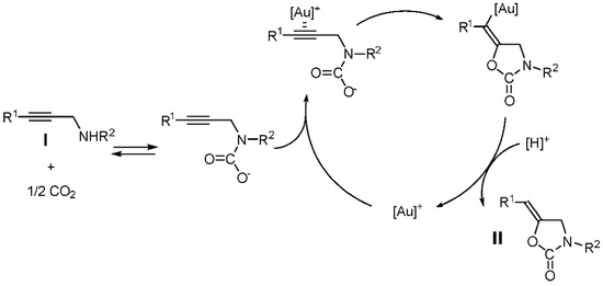 - Hase, S.; Kayaki, Y.; Ikariya, T. Mechanistic Aspects of the Carboxylative Cyclization of Propargylamines and Carbon Dioxide Catalyzed by Gold(I) Complexes Bearing an N-Heterocyclic Carbene Ligand. ACS Catal. 2015, 5, 5135–5140. [Google Scholar] [CrossRef]