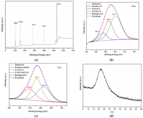 (a) XPS survey spectra, (b) N1s and (c) C1s high-resolution XPS spectra, and (d) XRD pattern of UFSi.