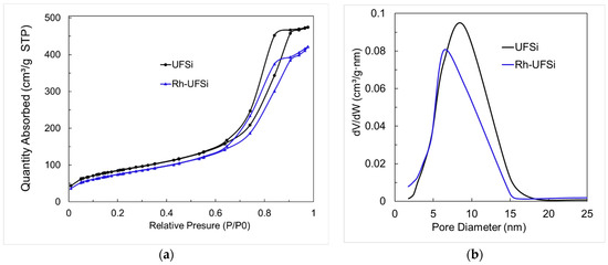 (a) N2 desorption isotherm curves and (b) pore size distributions of UFSi and Rh-UFSi.