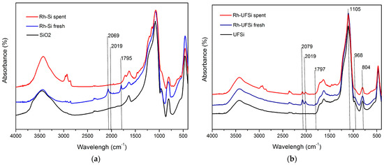 Figure 4 presents the IR spectra of the SiO2 and UFSi supports and the Rh-UFSi and Rh-Si catalysts, both fresh and after use in ten and three cycles.