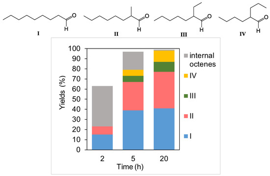 An increase in the reaction time makes it possible to achieve a quantitative conversion of the alkene into a mixture of aldehydes; noteworthily, 2-ethylheptanal (III) and 2-propylhexanal (IV) are formed in approximately equal amounts, regardless of the conditions (temperature, time, and pressure).