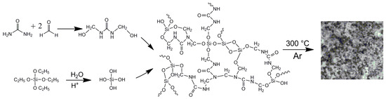 The procedure for the synthesis of the composite material comprises TEOS hydrolysis, the primary condensation of urea with formaldehyde to form methylolurea, and the subsequent co-polycondensation of the obtained derivatives (Scheme 1). Further heat treatment of the produced composite (300 °C, Ar) is accompanied by typical reactions of the carbonization process, such as cyclization and condensation, resulting in the formation of a hybrid organic–inorganic material UFSi, the elemental composition of which is presented in Table 1.