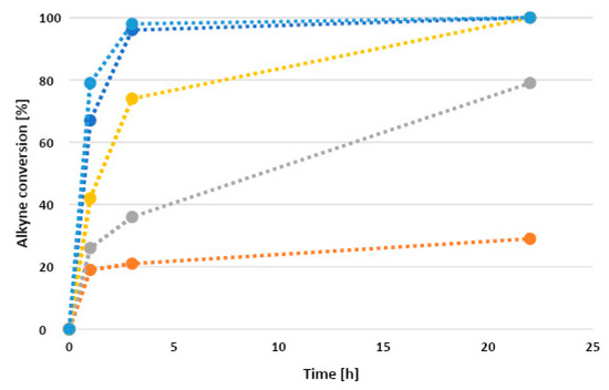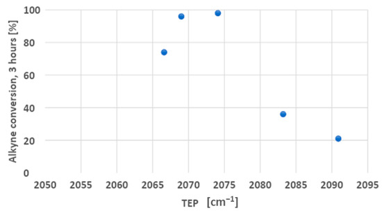 On the basis of the kinetic profiles reported above, it is clear that complexes with an intermediate TEP (2 and 3) were the most efficient, achieving 96% and 98% alkyne conversion after only 3 h reaction time. With the more electron-rich phosphane (1) the conversion was lower (74% after the same time). The conversion lowered again to 36% and 21% with the even less electron-donating ligands (4 and 5). Figure 3 illustrates the correlation between the ligands’ TEP and % conversion after 3 h reaction time.