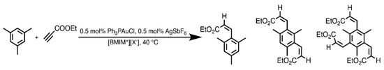 Chloro[triphenylphosphine]gold(I) (6.2 mg, 0.012 mmol), AgSbF6 (4.3 mg, 0.012 mmol), and the ionic liquid (0.75 mL) were placed in a Schlenk tube, which was then evacuated and filled with argon at room temperature. Ethyl propiolate (0.25 mL, 2.5 mmol) and mesitylene (0.35 mL, 2.5 mmol) were added into the Schlenk tube. The tube was placed in an oil bath thermostated at 40 °C and the reaction mixture was stirred for 23 h. Portions of the mixture (0.1 mL) were drawn off from the reaction mixture and analyzed by 1H NMR. Reaction products were identified by comparison with literature reported NMR data [20]. The products’ NMR data are reported in the previous paragraph.