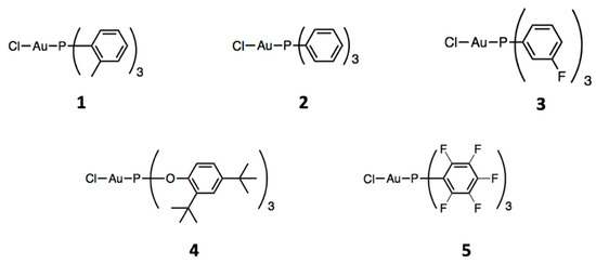 Like in the previous analysis, the precatalysts were activated in situ with the assistance of AgSbF6. Complexes 2 and 4 were commercial, the others were synthesized following the procedure reported in Section 3. All of the synthesized complexes were analyzed by 1H NMR, 31P NMR, and elemental analysis techniques.