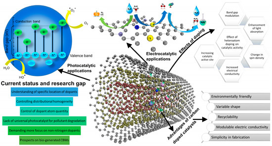 Although some existing reviews are available on the photocatalytic and electrocatalytic application of various doped CBMs, most of them are based on some specific CBM (e.g., carbon dots, graphene), specific element/s doping (e.g., doping with nitrogen), or some specific reactions (e.g., HER, ORR). For instance, recently, Salinas-Torres et al. [13] reviewed the application of nitrogen-doped CBMs for hydrogen-generation reactions. However, the effect of doping with other heteroatoms was not discussed in the article. Zhang et al. [14] studied the recent advances in the application of doped carbon dots for electrocatalytic reactions. However, the study was confined to carbon dots only. Other heteroatom-doped CBMs, such as graphene, GCN, and CNTs, were not reviewed. Hu et al. [15] reviewed the doped CBMs for various electrocatalysis reactions. The photocatalytic application of such materials was not discussed in the study. Other review articles based on the N-doped CBMs for ORR [16], transition metals doped CBMs for HER [17], catalytic applications of metal-N-doped CBMs [18], and electrocatalytic applications of non-N-doped CBMs [19] are also available. However, to the best of the authors’ knowledge, there is no review in the literature where the role and underlying chemistry of heteroatom doping on the electrocatalytic and photocatalytic behavior of different CBMs (e.g., graphene, carbon dots, GCN, CNTs, etc.) have been discussed together. In addition, the comparisons between the catalytic performances of the doped CBMs and the origin of their performance deviations have not yet been reviewed collectively in any study (Figure 1).