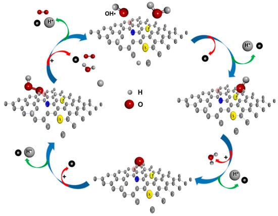 Each stage involves the release of a single electron. Therefore, OER involves a four-electron transfer pathway and is a much more complicated and energy-consuming process [23,24,25,26,27]. The primary challenges of these multi-electron transfer systems are the high overpotential and the energy barrier of the rate-determining phase (Figure 3a). The essential overpotential of the reaction might be avoided by stabilizing the HOO* concerning HO* intermediate on the catalyst surface. Catalytically, precious metal complexes have a good size-to-performance ratio, but they are also volatile organic compounds, costly, and potentially toxic. Graphene, a 2D material derived from carbon, was introduced in the latter part of the twenty-first century to alter, help, or replace these metal-based electrocatalysts [25]. Due to their adjustable molecular structures, abundance, and excellent tolerance to acidic and alkaline environments, many carbon-based materials provide distinct advantages for targeted catalysis. Low-dimensional carbon materials have recently demonstrated their potential as metal-free catalysts in energy-related electrocatalytic OERs [26]. For instance, graphene is the most effective alternative catalyst due to its sp2 carbon atoms being organized in a honeycomb shape with a π-π conjugation as well as its great mechanical strength and electrical conductivity [27].
