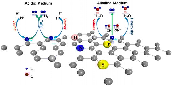 Though pristine carbon materials show very poor catalytic activity, a slight chemical modification of the material via doping of some heteroatoms can significantly increase the electrocatalytic nature of CBMs in the case of HER [73]. Because heteroatoms differ in size and electron negativity from carbon atoms, the introduction of heteroatoms may cause electron modulation to change the charge distribution and electronic properties of carbon skeletons, affecting their interaction with hydrogen intermediates and, ultimately, their electrocatalytic activities for the HER [74]. This, together with the doping-induced flaws, has the potential to modify the chemical activity of carbon materials resulting in increased electrocatalytic activity, notably in water splitting.